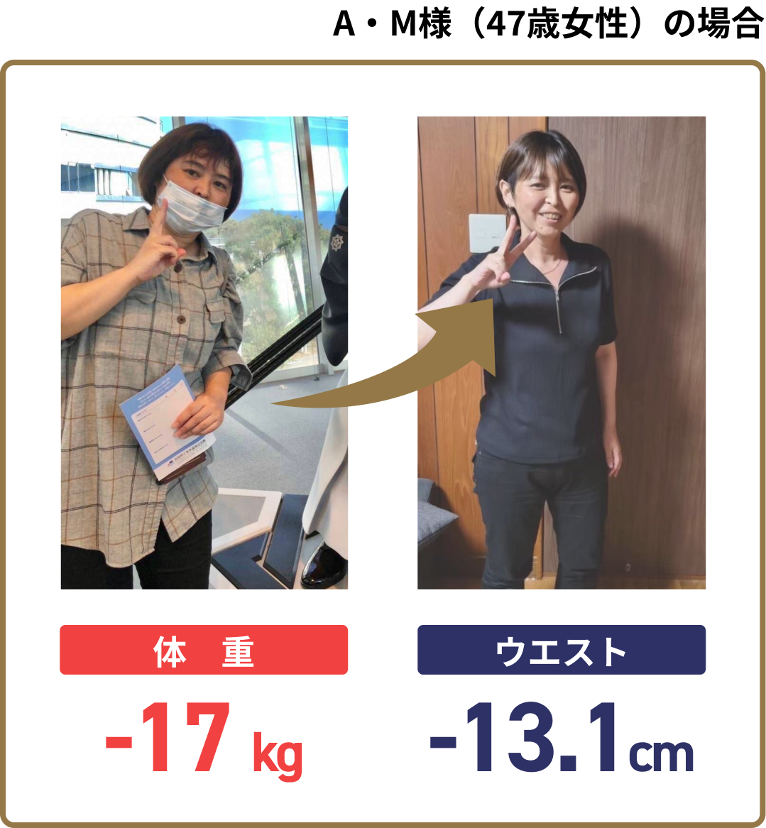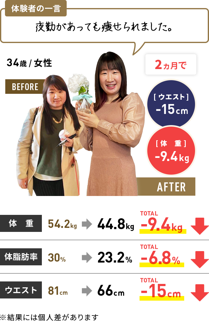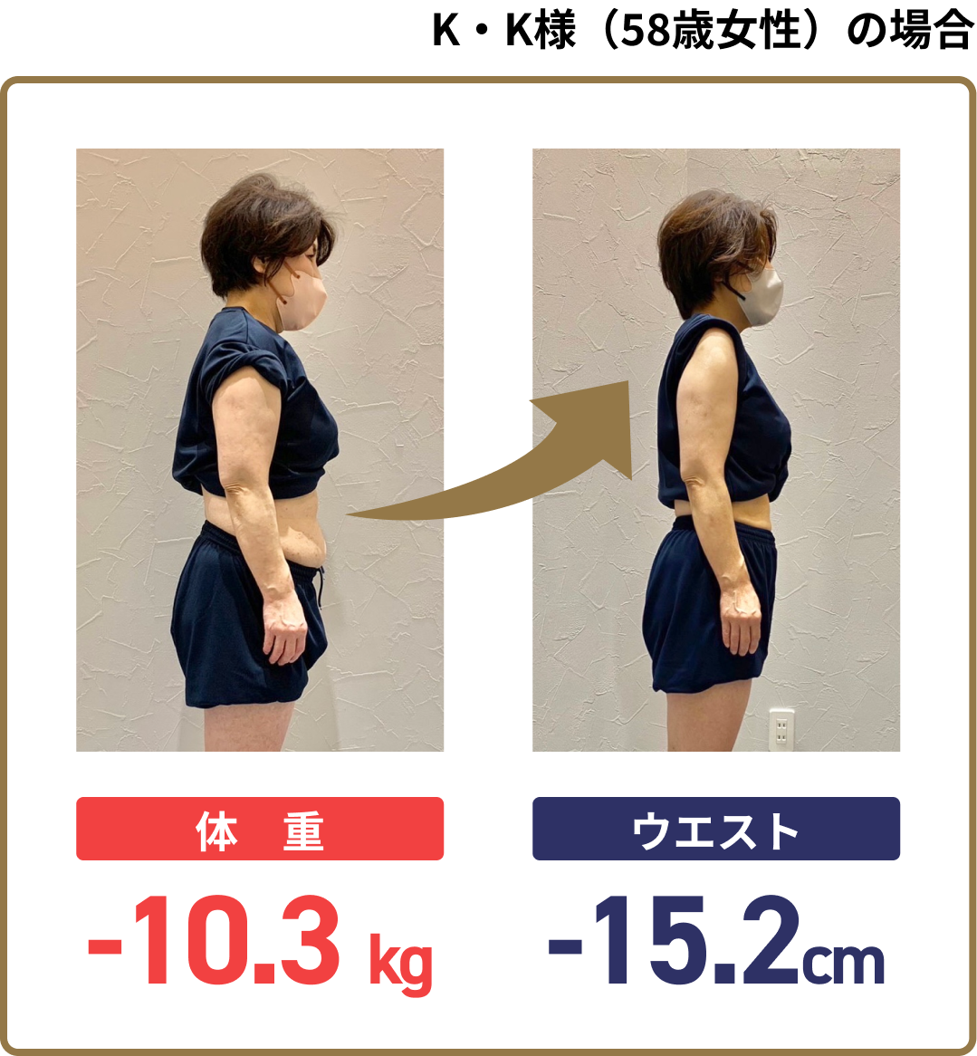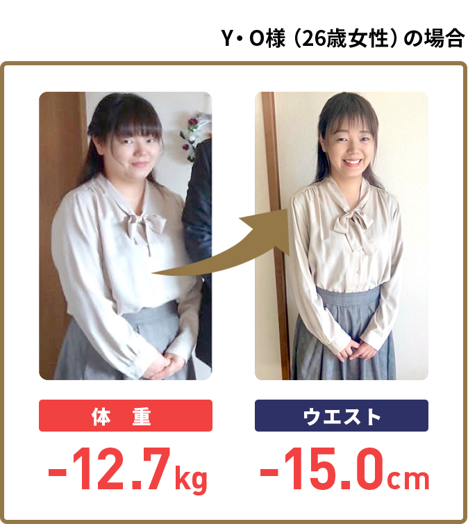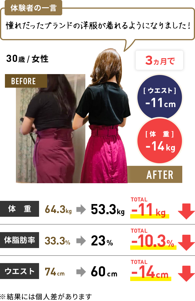 2週間の短期集中でのダイエットや3ヶ月以上かけて-10kg以上のダイエットをされる方も多くいらっしゃいます。