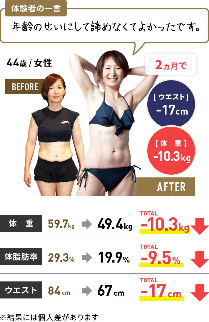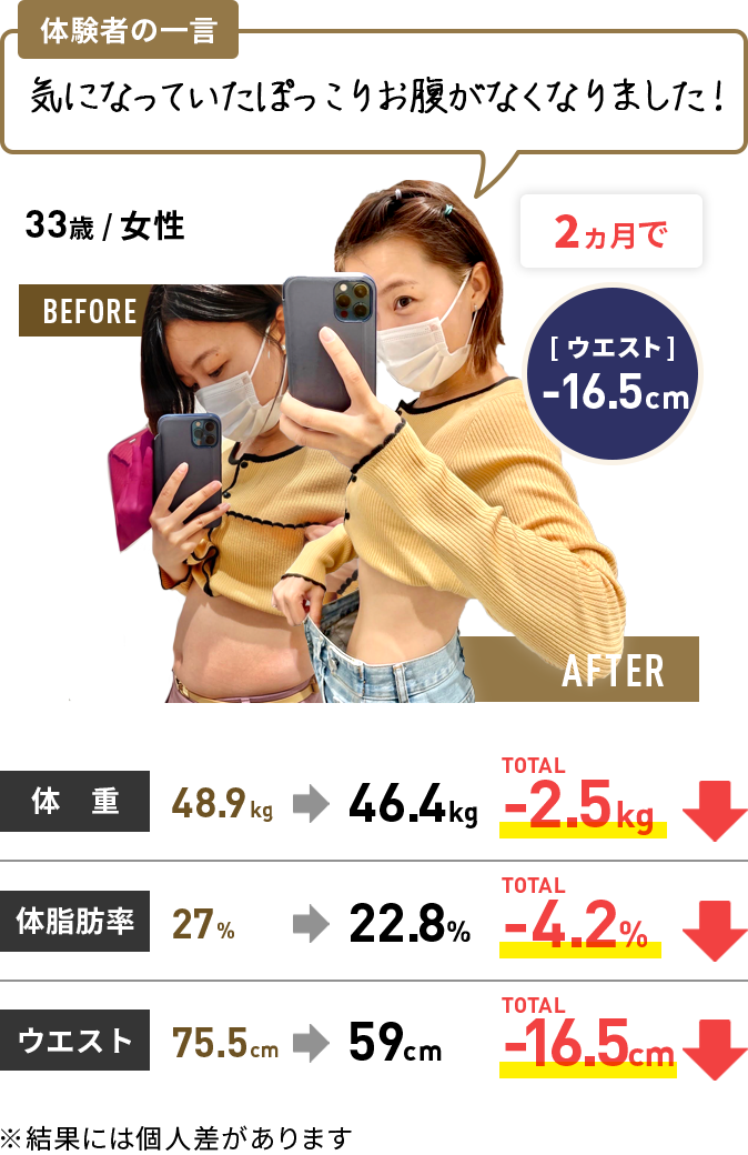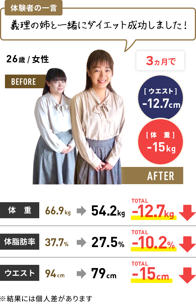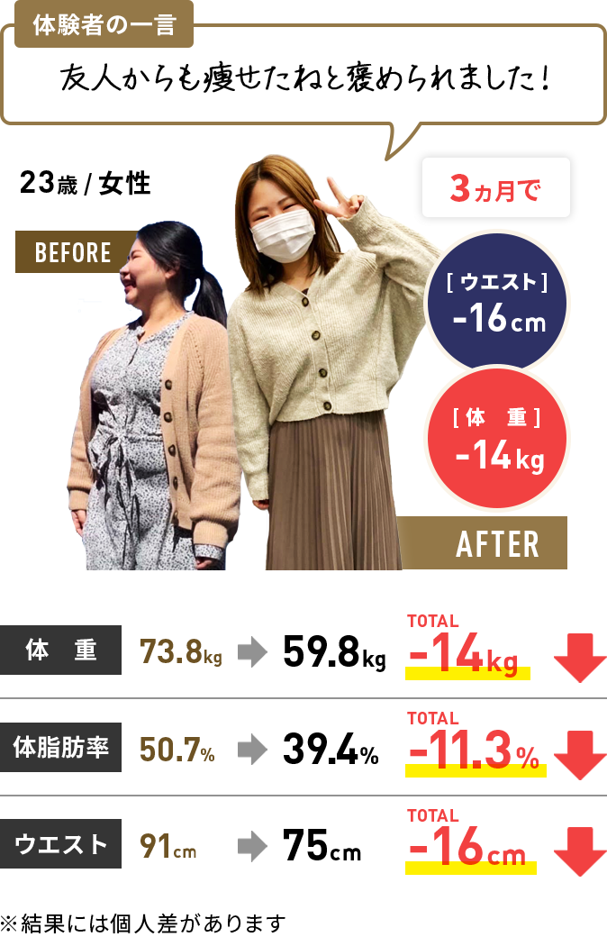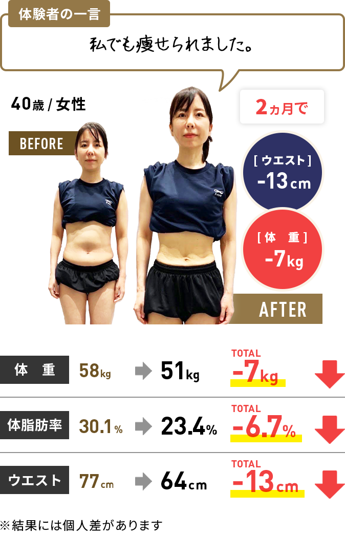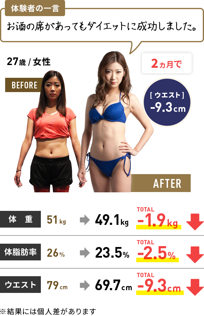 ダイエット成功の鍵は“ モチベーション ”です。一人で行うダイエットでもある程度体重を落とすことが可能ですが、私たちはその次のステップとしてさらに体重や体脂肪を落とすことが出来ます。素早く結果が出て楽しみながらダイエットを進めていくことができ、自然とモチベーションが高いままダイエットができます。