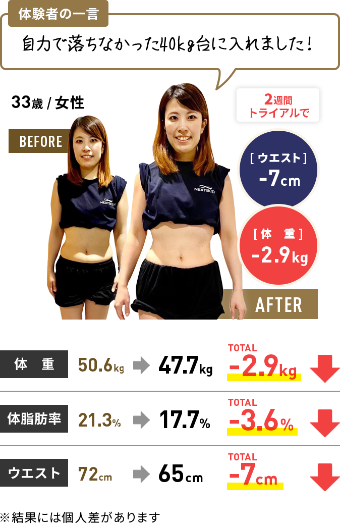 トレーナーと一緒にダイエットを進めているので、過去にフィットネスジムに通わなくなられた経験のあるお客様もNEXTBODYでは楽しんで継続ができております。